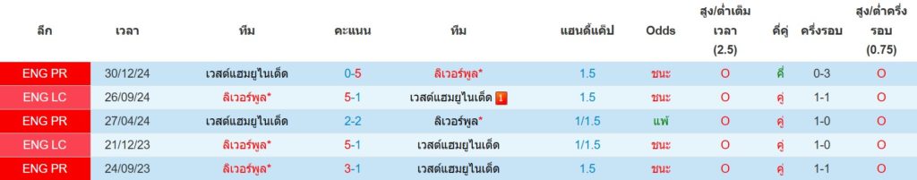 สถิติการพบกันล่าสุดของ : ลิเวอร์พูล -vs- เวสต์แฮม ยูไนเต็ด