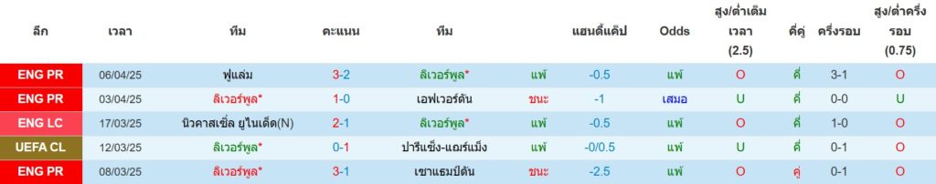 สถิติ 5 นัดล่าสุดของ ลิเวอร์พูล : ชนะ 2 เสมอ 0 แพ้ 3