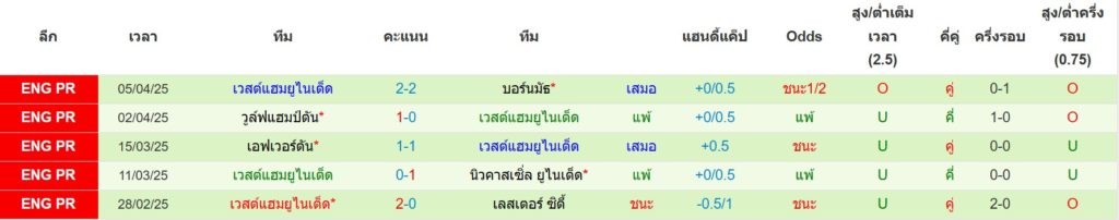 สถิติ 5 นัดล่าสุดของ เวสต์แฮม ยูไนเต็ด : ชนะ 1 เสมอ 2 แพ้ 2