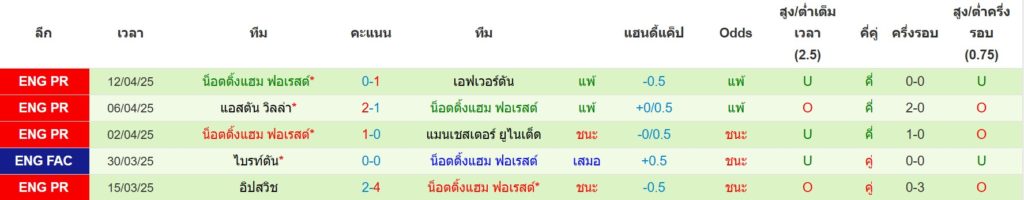 สถิติ 5 นัดล่าสุดของ น็อตติ้งแฮม ฟอเรสต์ : ชนะ 2 เสมอ 1 แพ้ 2