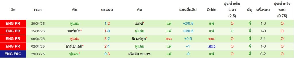 สถิติ 5 นัดล่าสุดของ ฟูแล่ม : ชนะ 1 เสมอ 0 แพ้ 4