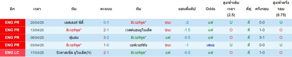 สถิติ 5 นัดล่าสุดของ ลิเวอร์พูล : ชนะ 3 เสมอ 0 แพ้ 2