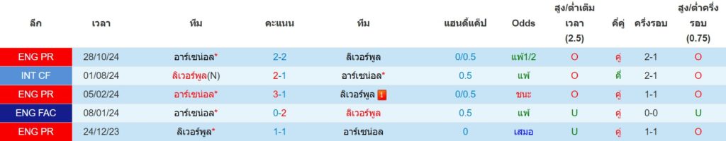 สถิติการพบกันล่าสุดของ : ลิเวอร์พูล -vs- อาร์เซน่อล