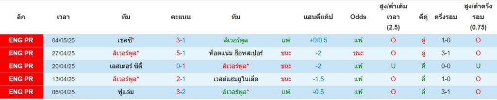 สถิติ 5 นัดล่าสุดของ ลิเวอร์พูล : ชนะ 3 เสมอ 0 แพ้ 2