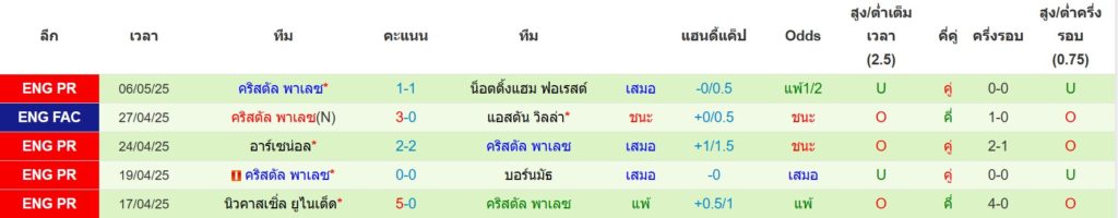 สถิติ 5 นัดล่าสุดของ คริสตัล พาเลซ : ชนะ 1 เสมอ 3 แพ้ 1
