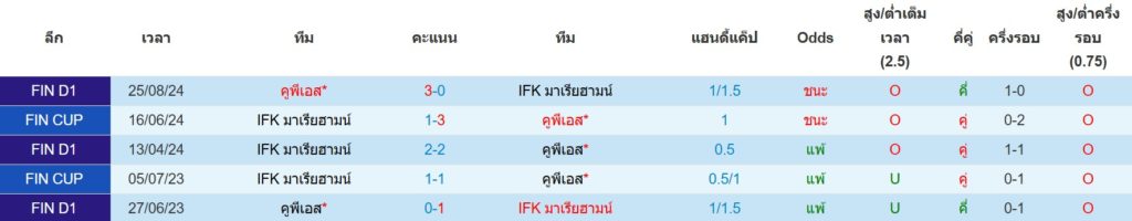 สถิติการพบกันล่าสุดของ : คูพีเอส -vs- มารีฮามน์