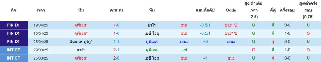 สถิติ 5 นัดล่าสุดของ คูพีเอส : ชนะ 3 เสมอ 1 แพ้ 1