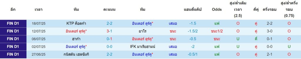 สถิติ 5 นัดล่าสุดของ อินเตอร์ ตูร์คู : ชนะ 2 เสมอ 3 แพ้ 0