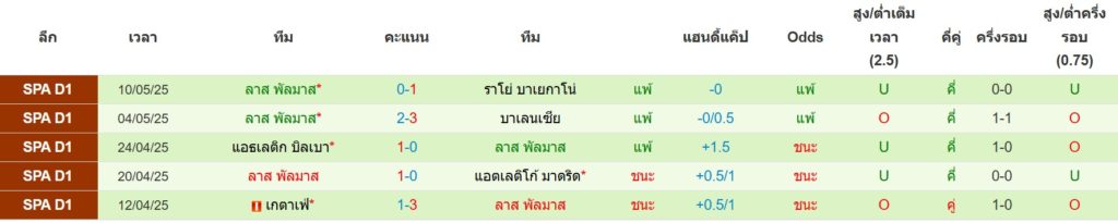 สถิติ 5 นัดล่าสุดของ ลาส พัลมาส : ชนะ 2 เสมอ 0 แพ้ 3