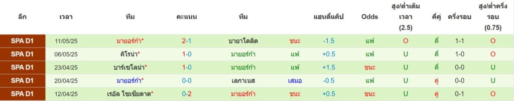 สถิติ 5 นัดล่าสุดของ มายอร์ก้า : ชนะ 2 เสมอ 1 แพ้ 2