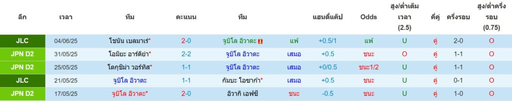 สถิติ 5 นัดล่าสุดของ จูบิโล่ อิวาตะ : ชนะ 1 เสมอ 3 แพ้ 1