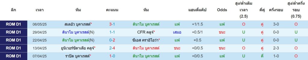 สถิติ 5 นัดล่าสุดของ ดินาโม บูคาเรสต์ : ชนะ 1 เสมอ 1 แพ้ 3
