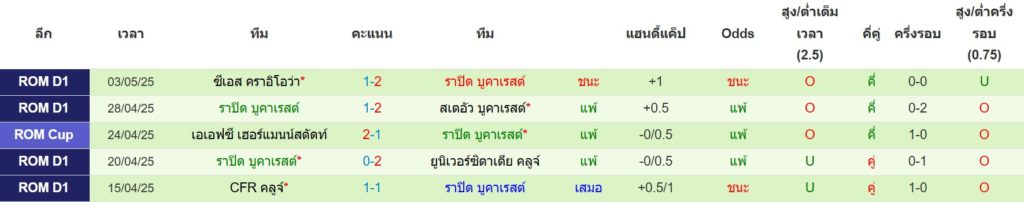 สถิติ 5 นัดล่าสุดของ ราปิด บูคาเรสต์ : ชนะ 1 เสมอ 1 แพ้ 3