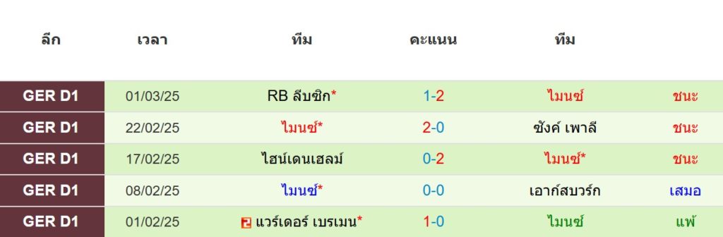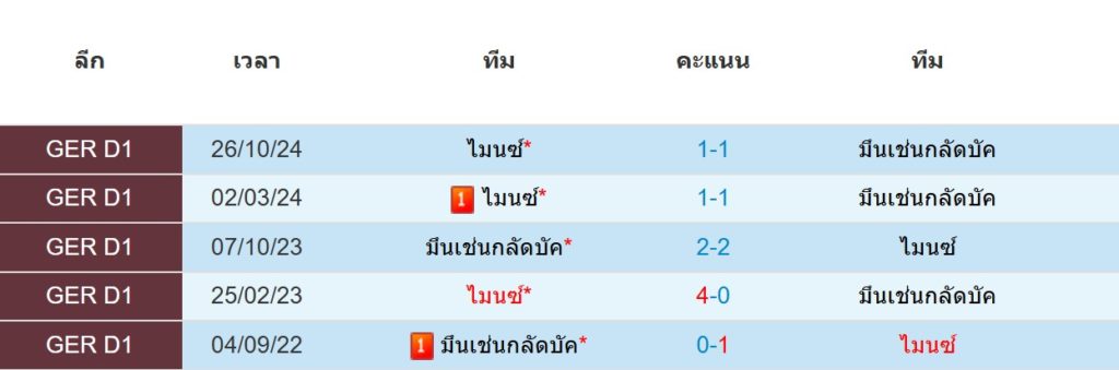 สถิติการพบกันล่าสุดของ : มึนเช่นกลัดบัค -vs- ไมนซ์