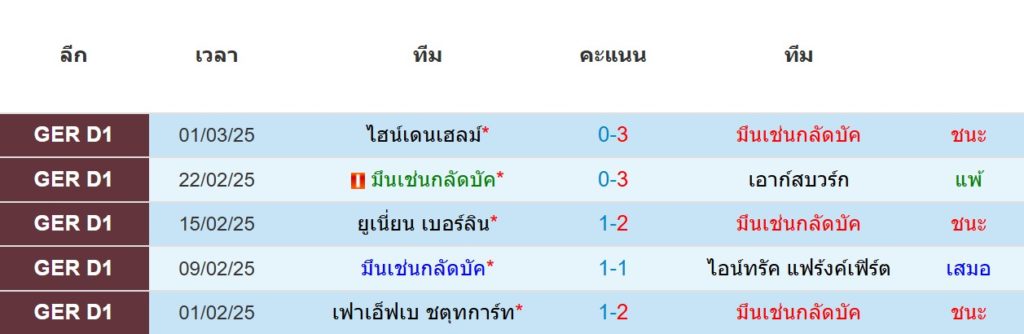 สถิติ 5 นัดล่าสุดของ มึนเช่นกลัดบัค : ชนะ 3 เสมอ 1 แพ้ 1