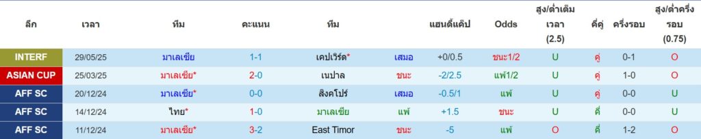 สถิติ 5 นัดล่าสุดของ มาเลเซีย : ชนะ 2 เสมอ 2 แพ้ 1