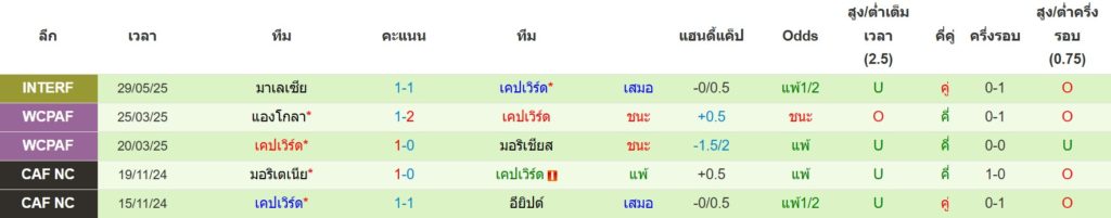 สถิติ 5 นัดล่าสุดของ เคปเวิร์ด : ชนะ 2 เสมอ 2 แพ้ 1