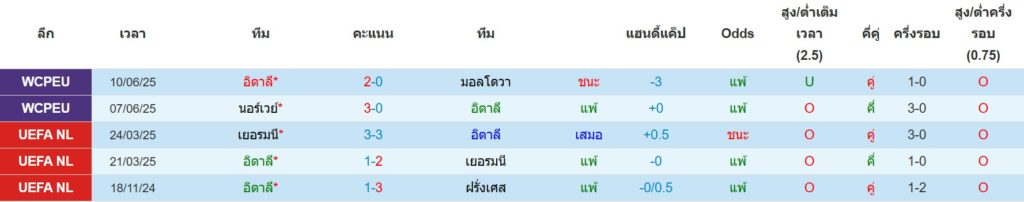 สถิติ 5 นัดล่าสุดของ อิตาลี : ชนะ 1 เสมอ 1 แพ้ 3