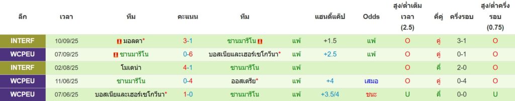 สถิติ 5 นัดล่าสุดของ ซาน มาริโน่ : ชนะ 0 เสมอ 0 แพ้ 5