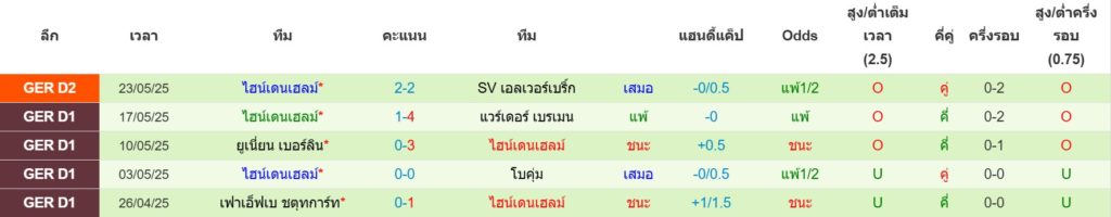สถิติ 5 นัดล่าสุดของ ไฮเด้นไฮม์ : ชนะ 2 เสมอ 2 แพ้ 1