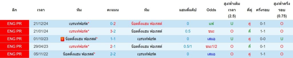 สถิติการพบกันล่าสุดของ : น็อตติ้งแฮม ฟอเรสต์ -vs- เบรนท์ฟอร์ด