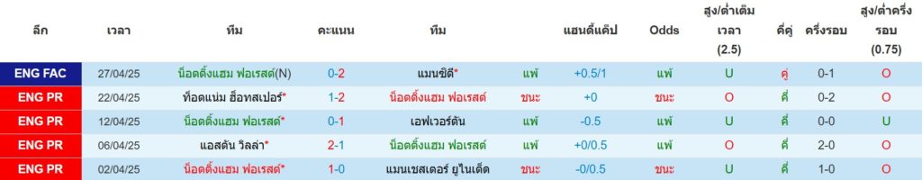 สถิติ 5 นัดล่าสุดของ น็อตติ้งแฮม ฟอเรสต์ : ชนะ 2 เสมอ 0 แพ้ 3