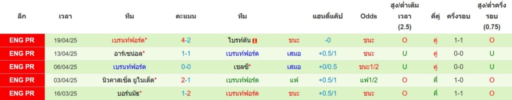 สถิติ 5 นัดล่าสุดของ เบรนท์ฟอร์ด : ชนะ 2 เสมอ 2 แพ้ 1