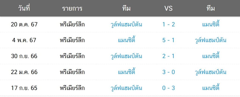 สถิติการพบกันล่าสุดของ : แมนฯซิตี้ -vs- วูล์ฟส์