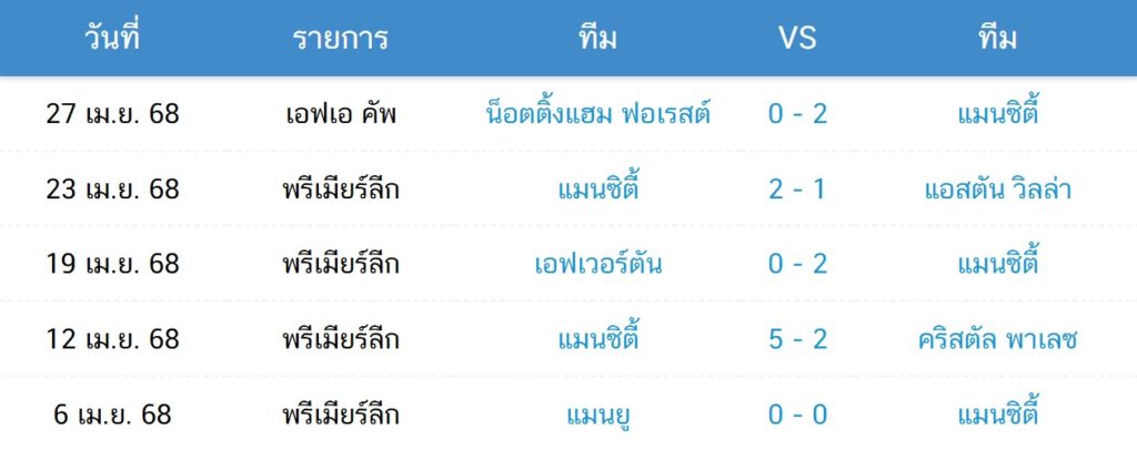 สถิติ 5 นัดล่าสุดของ แมนฯซิตี้ : ชนะ 4 เสมอ 1 แพ้ 0