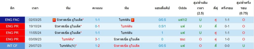 สถิติการพบกันล่าสุดของ : ไบรท์ตันฯ -vs- นิวคาสเซิ่ล