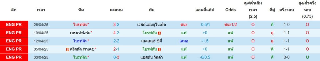 สถิติ 5 นัดล่าสุดของ ไบรท์ตันฯ : ชนะ 1 เสมอ 1 แพ้ 3