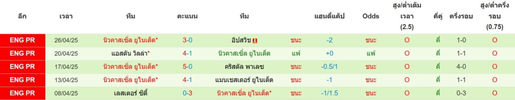 สถิติ 5 นัดล่าสุดของ นิวคาสเซิ่ล : ชนะ 4 เสมอ 0 แพ้ 1