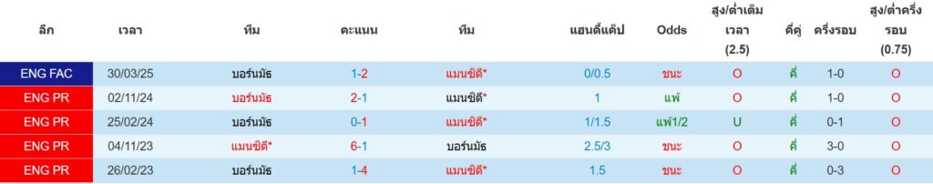สถิติการพบกันล่าสุดของ : แมนฯซิตี้ -vs- บอร์นมัธ