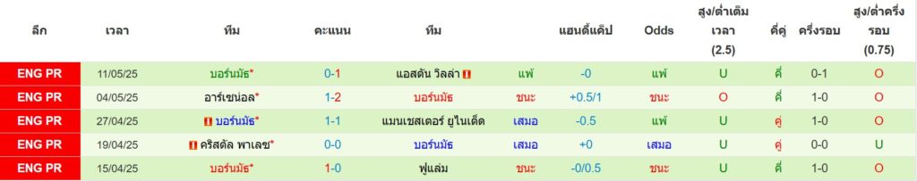 สถิติ 5 นัดล่าสุดของ บอร์นมัธ : ชนะ 2 เสมอ 2 แพ้ 1