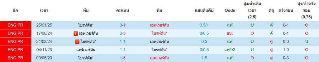 สถิติการพบกันล่าสุดของ : เอฟเวอร์ตัน -vs- ไบรท์ตันฯ