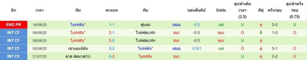 สถิติ 5 นัดล่าสุดของ ไบรท์ตันฯ : ชนะ 3 เสมอ 2 แพ้ 0