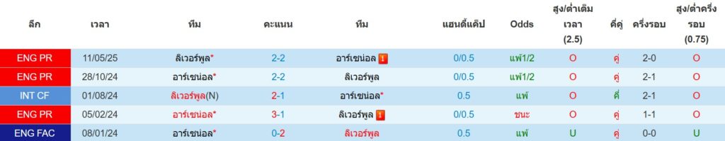 สถิติการพบกันล่าสุดของ : ลิเวอร์พูล -vs- อาร์เซน่อล