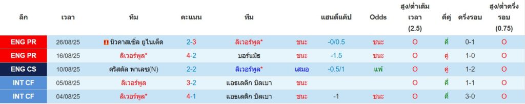 สถิติ 5 นัดล่าสุดของ ลิเวอร์พูล : ชนะ 4 เสมอ 1 แพ้ 0