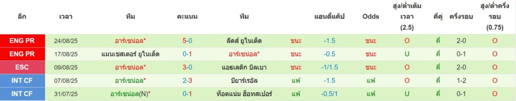 สถิติ 5 นัดล่าสุดของ อาร์เซน่อล : ชนะ 3 เสมอ 0 แพ้ 2