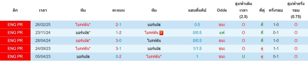 สถิติการพบกันล่าสุดของ : บอร์นมัธ -vs- ไบรท์ตันฯ