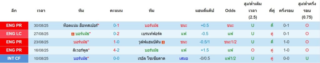 สถิติ 5 นัดล่าสุดของ บอร์นมัธ : ชนะ 2 เสมอ 1 แพ้ 2