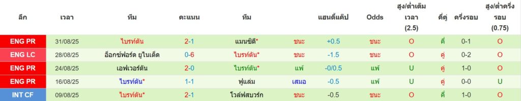 สถิติ 5 นัดล่าสุดของ ไบรท์ตันฯ : ชนะ 3 เสมอ 1 แพ้ 1
