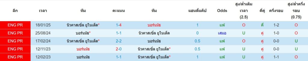 สถิติการพบกันล่าสุดของ : บอร์นมัธ -vs- นิวคาสเซิ่ล