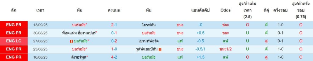 สถิติ 5 นัดล่าสุดของ บอร์นมัธ : ชนะ 3 เสมอ 0 แพ้ 2
