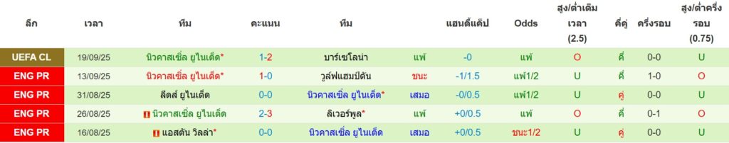 สถิติ 5 นัดล่าสุดของ นิวคาสเซิ่ล : ชนะ 1 เสมอ 2 แพ้