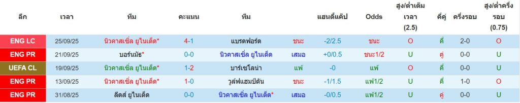 สถิติ 5 นัดล่าสุดของ นิวคาสเซิ่ล : ชนะ 2 เสมอ 2 แพ้ 1