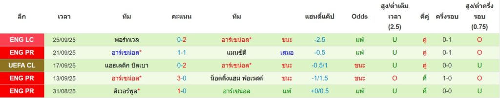 สถิติ 5 นัดล่าสุดของ อาร์เซน่อล : ชนะ 3 เสมอ 1 แพ้ 1