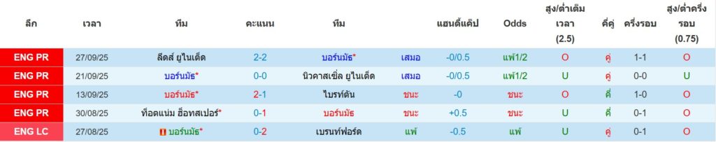 สถิติ 5 นัดล่าสุดของ บอร์นมัธ : ชนะ 2 เสมอ 2 แพ้ 1