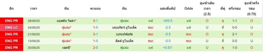 สถิติ 5 นัดล่าสุดของ ฟูแล่ม : ชนะ 3 เสมอ 0 แพ้ 2