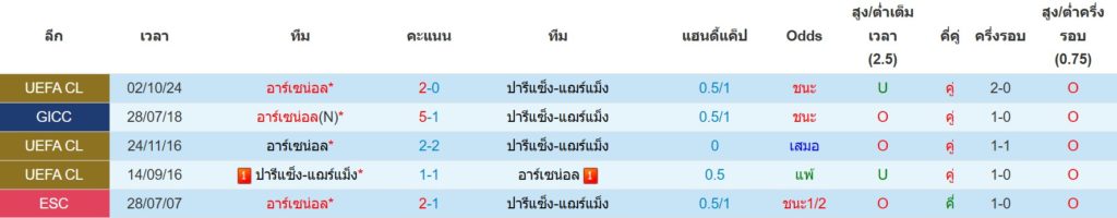 สถิติการพบกันล่าสุดของ : อาร์เซน่อล -vs- ปารีส แซงต์ แชร์กแมง